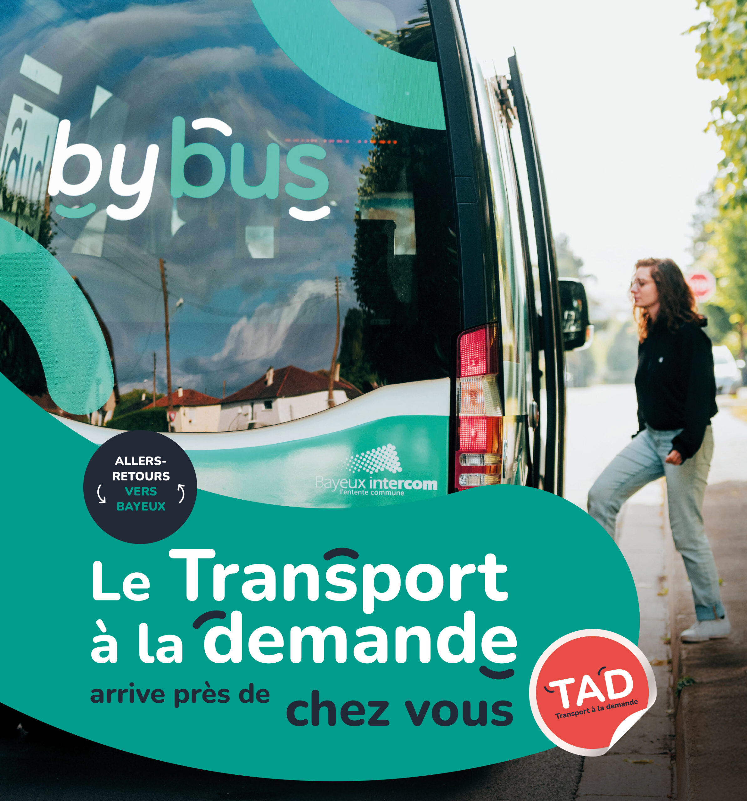 Pour compléter l’offre de bus Bybus, Bayeux Intercom propose un service de transport à la demande (TAD) sur réservation. Suite à une restructuration du service, le TAD dessert à présent les 36 communes de l’intercommunalité, deux jours par semaine :